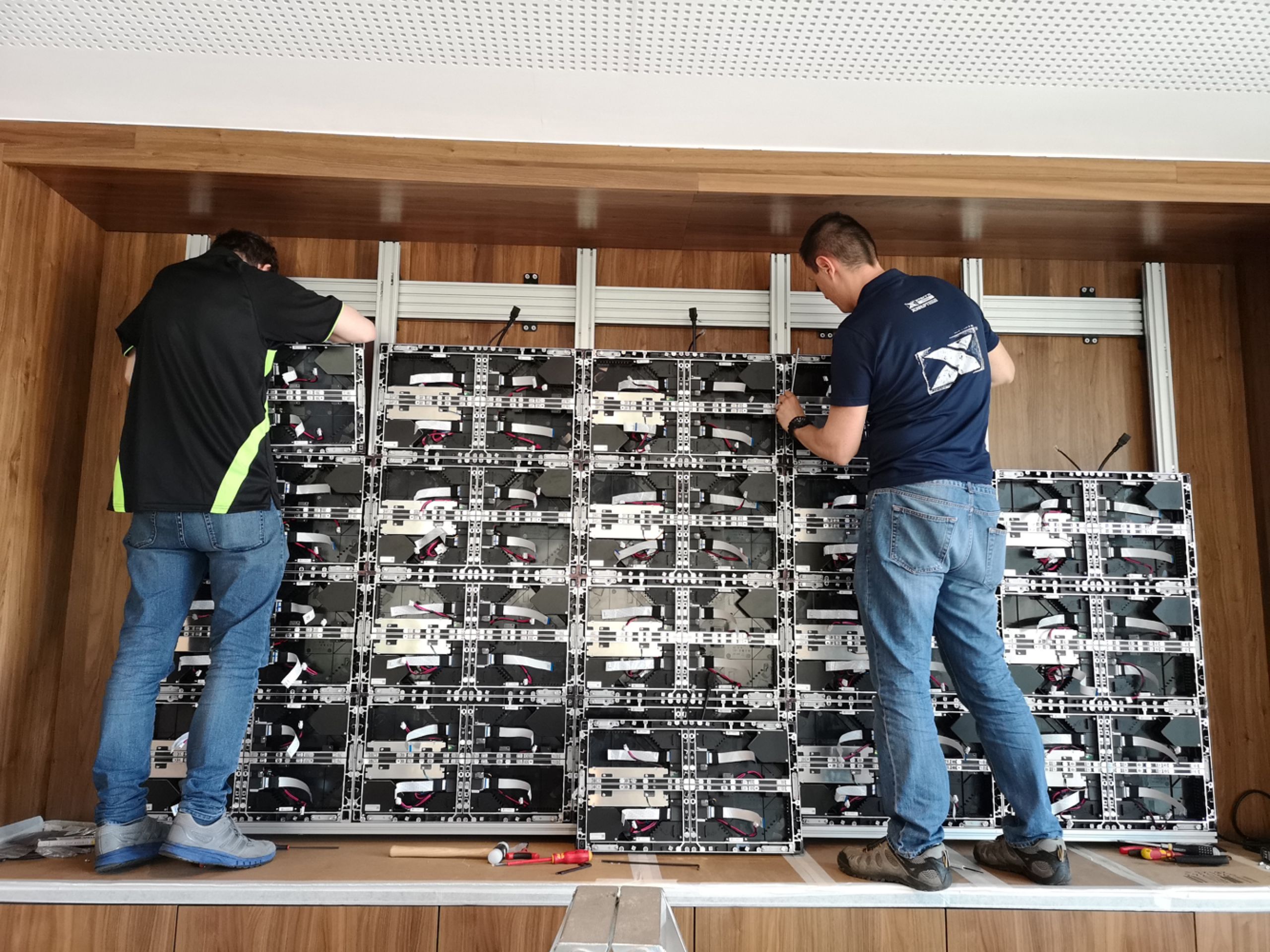 Pour remédier à cette situation pour le moins complexe, nous avons analysé les différentes options techniques á notre disposition, mais également l’agencement général et le type de mobilier présent. Nous avons opté pour la mise en place d’un vidéo wall full LED très lumineux sur-mesure completement en accord avec mobilier existant. Les sources video et audio sont gérées par un panel soft touch repris sur réseau IT, la pose des processeurs vidéo est faite dans une régie annexe.