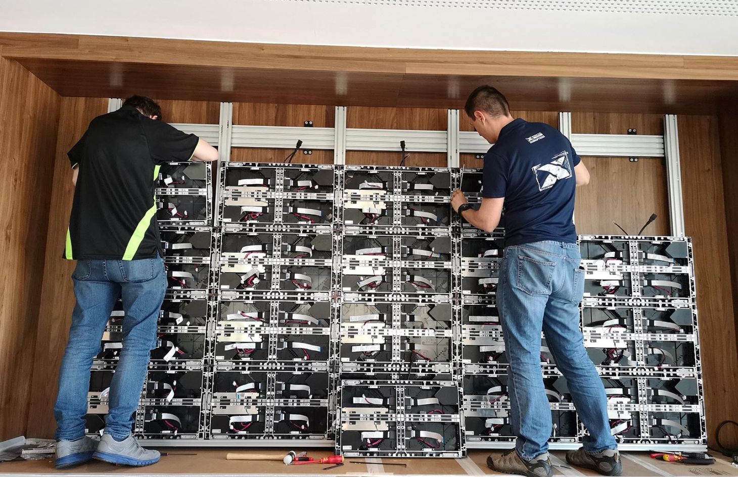 L’équipe d’Electro Hauser construit un videowall sur–mesure pour la grande salle de réunion du Foyer Assurances à Leudelange.